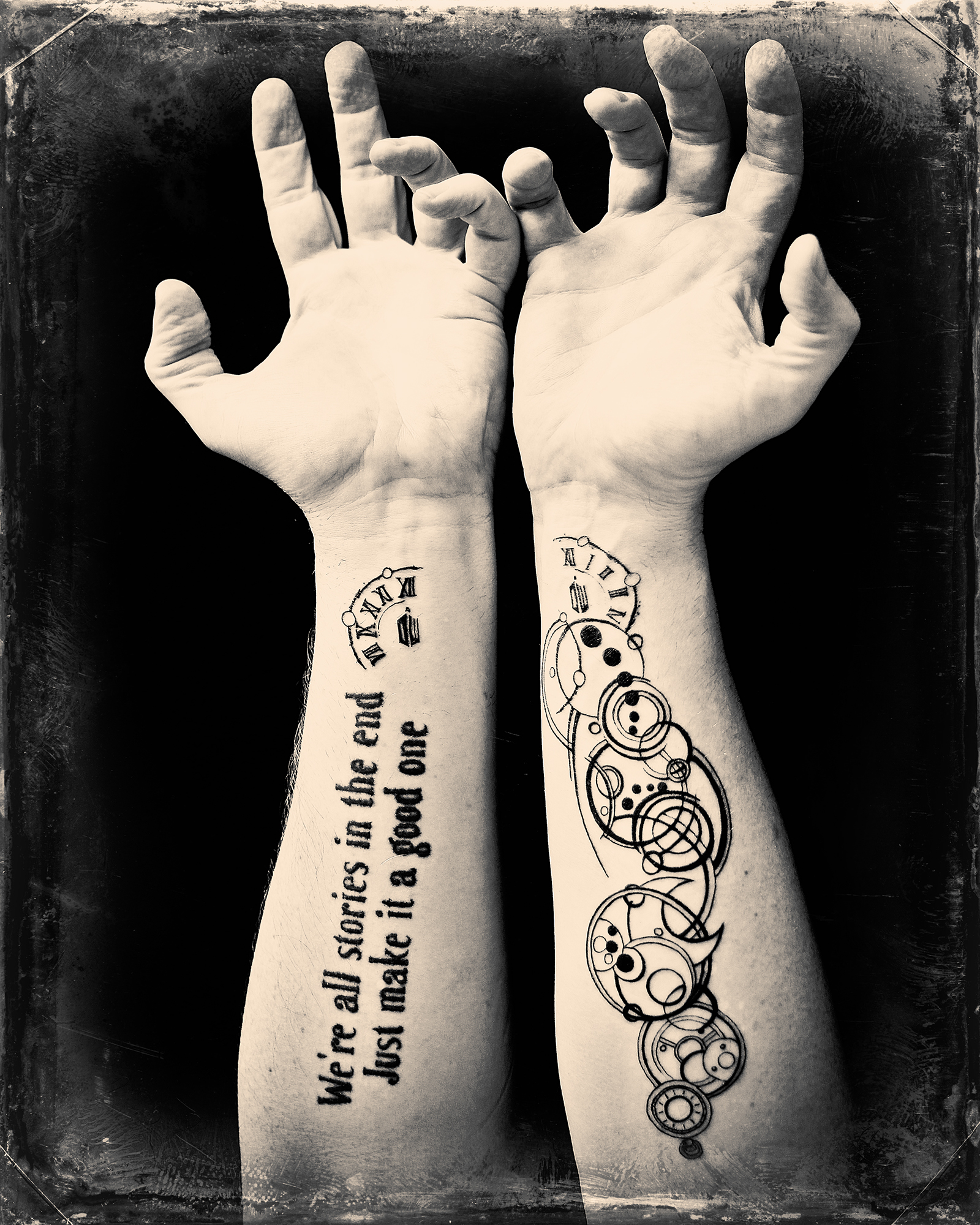 Got a new tattoo! On my right arm. It’s a companion to the Doctor Who quote on my left arm – “We are all stories in the end, just make it a good one”. This one says the same thing, but in Gallifreyan, plus a bunch of other Whovian design elements as well. Once again provided by the excellent Yessenia. Thank you for a great job Yess!